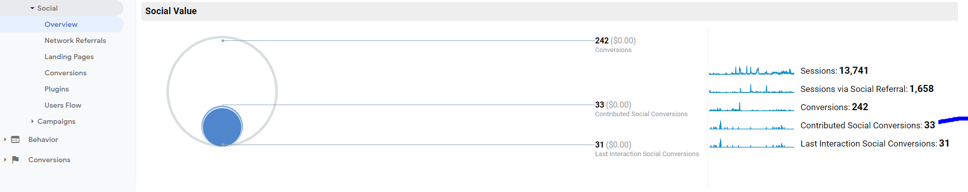 Contributed conversions are one of the easiest ways to under value social media. These won’t show up in 95% of the other reports in Google Analytics but again, social media often plays a significant role in the middle funnel of buyers journeys an ultimately contributes to people choosing to do business with your company. The contributed conversions report helps get a better understanding of the role social media is playing in that sense.