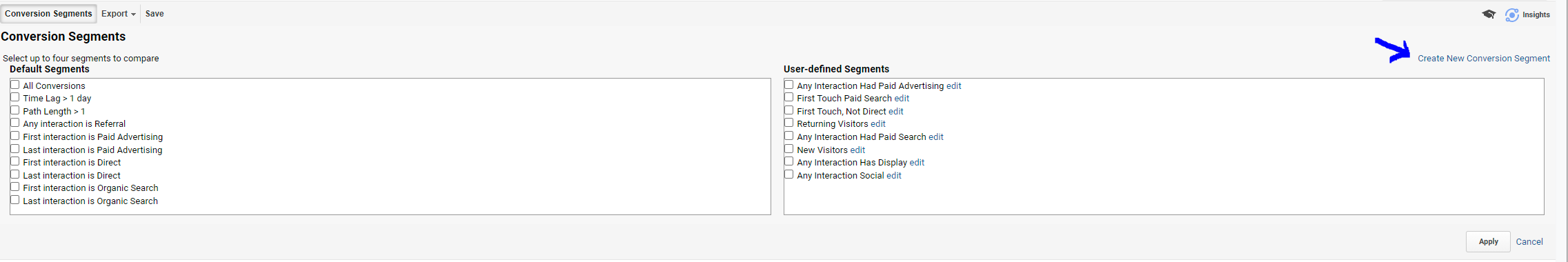 Click on the conversion segments button next to the path length drop down. Next click on Create New Conversion Segment .