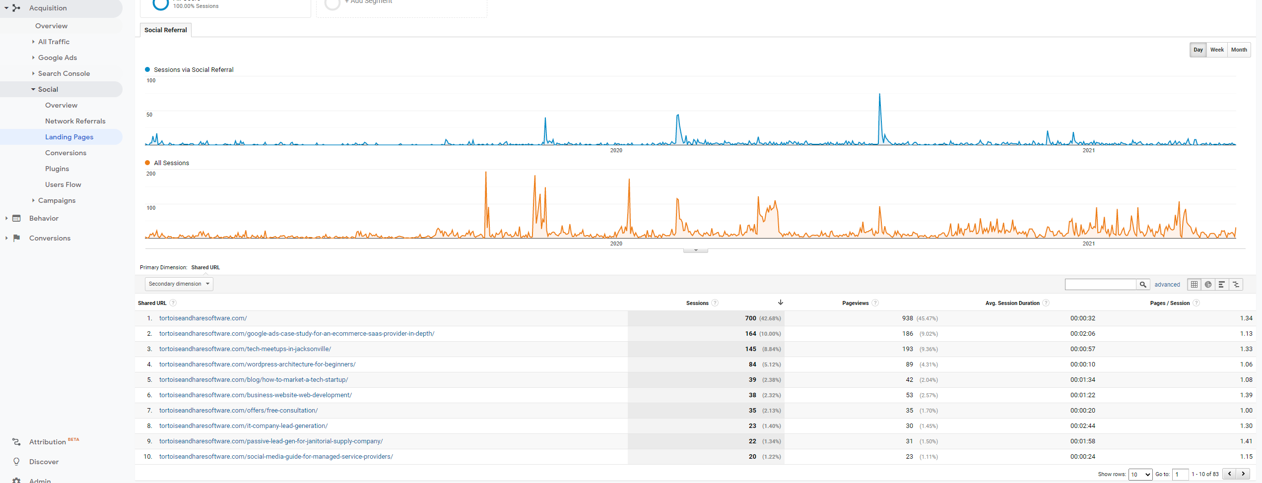 One other report I like to check out within this same group is the landing pages report, found by going to Acquisition > Social > Landing Pages.