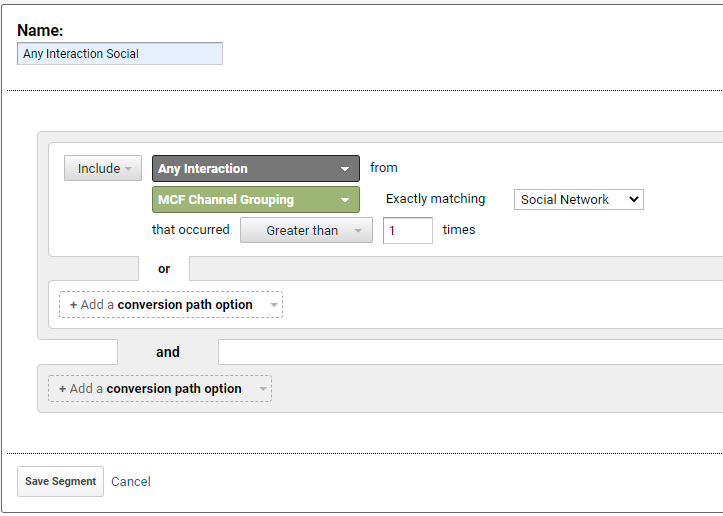 Name your segment and change the settings to include any interaction from a MCF Channel Grouping that is exactly matching Social Network that occurred greater than 1 times as shown in the image below. Click save segment.