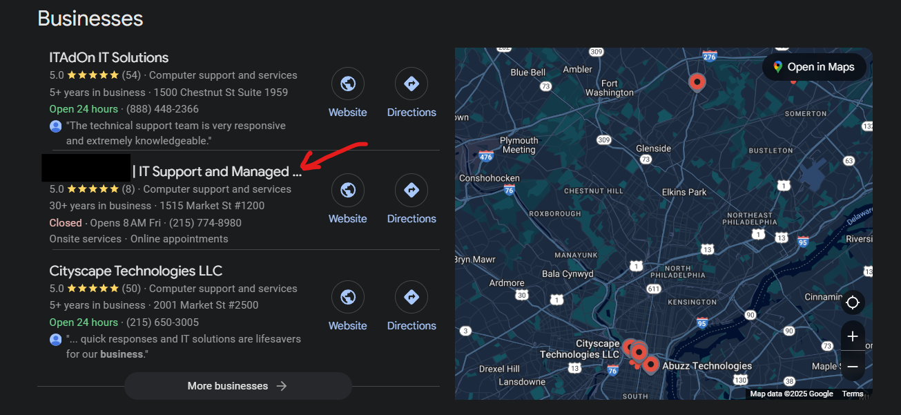 In fact we rarely see searches for common known converting keywords in a competitive market that don’t have at least 1-2 competitors with keyword stuffed profiles in the top results. There will always be companies trying to gain this advantage. For instance this search for “managed IT services Philadelphia” has a keyword stuffed listing in the map pack.
