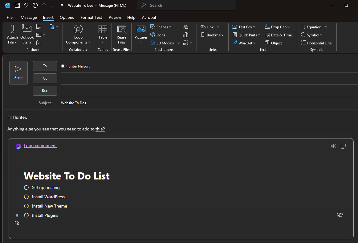 - Task Management: Show clients how they can create and track tasks using Loop components within emails, which is especially helpful for small teams without a separate project management system. For example, a to-do list component can be updated by team members, making it easy to track who is responsible for what without leaving Outlook.