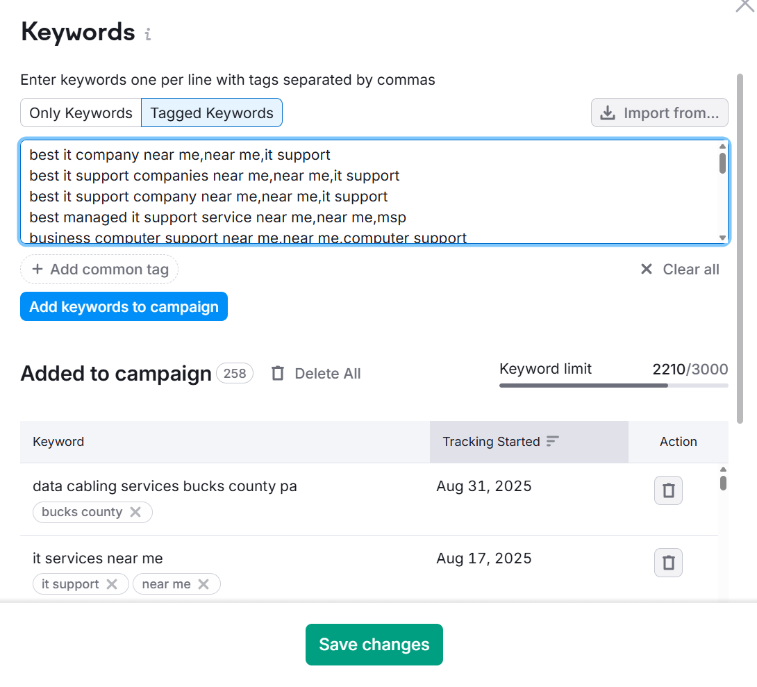 Open Position Tracking in SEMrush and use the import option. Paste or upload your keyword list and include the comma separated Tags field from your spreadsheet. SEMrush will attach those tags so you can filter by domain, location, and modifiers as part of your MSP keyword research.