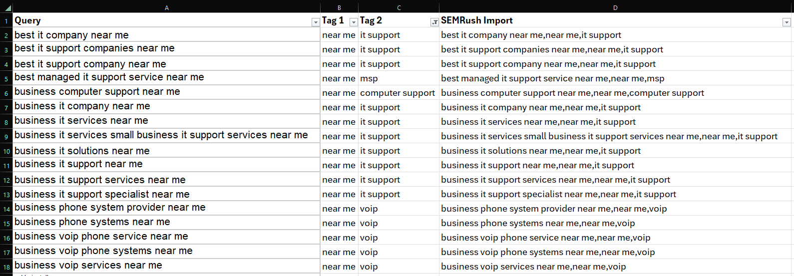 Most keywords deserve more than one tag. For example, “it support near me” should carry both a domain tag and a modifier tag: