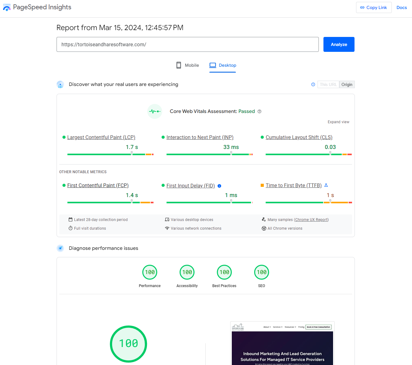 First off lets talk about how to measure the performance of your website so that you can get a baseline for how your MSPs website is performing. A great starting point is the Google PageSpeed Insights Tool. Google PageSpeed Insights is a powerful tool provided by Google that evaluates the performance of web pages and provides actionable insights for optimization. By analyzing the content of a webpage and running performance tests, PageSpeed Insights generates a comprehensive report highlighting areas for improvement in terms of loading speed and user experience. The tool assigns a score to the webpage based on the Core Web Vitals, including Largest Contentful Paint (LCP), Total Blocking Time (TBT), and Cumulative Layout Shift (CLS), among others. Additionally, PageSpeed Insights offers suggestions and optimizations tailored to enhance performance, such as optimizing images, eliminating render-blocking resources, and leveraging browser caching. With its user-friendly interface and detailed recommendations, Google PageSpeed Insights empowers managed service providers to optimize their websites for speed, usability, and search engine visibility.