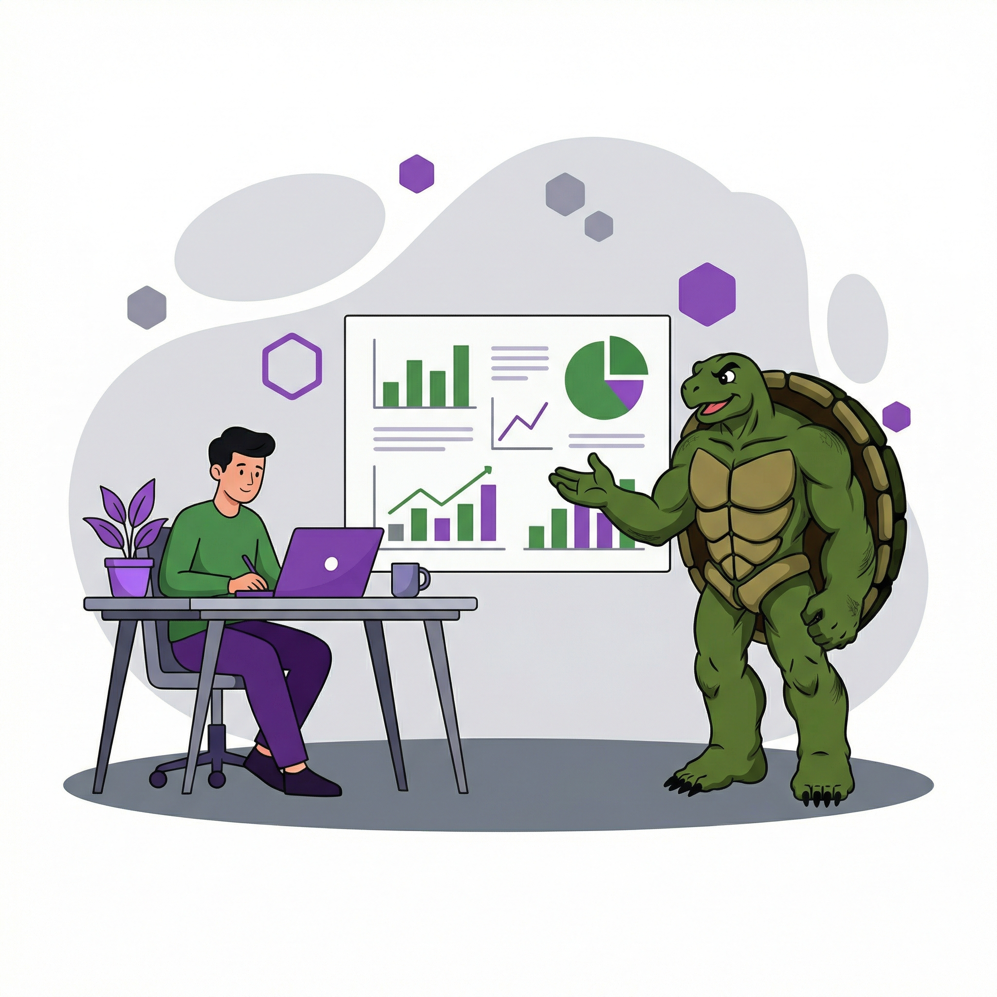branded character illustration of a tortoise overlain on a SERP, showing the concept of climbing the ranks on search engines.